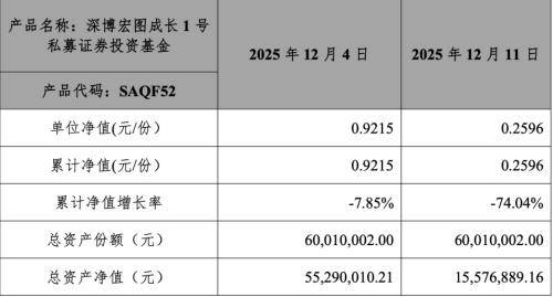 2025年3月,圣元环保全资子公司厦门金陵基建筑工程有限公司,斥资6000万元认购了“深博宏图成长1号私募证券投资基金”。根据公告,该基金净值在圣元环保计划赎回的一周内出现了断崖式下跌。12月4日,基金单位净值为0.9215元,而到了12月11日,已骤降至0.2596元,一周内跌幅超过70%。