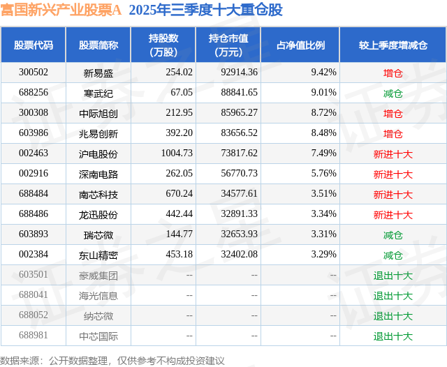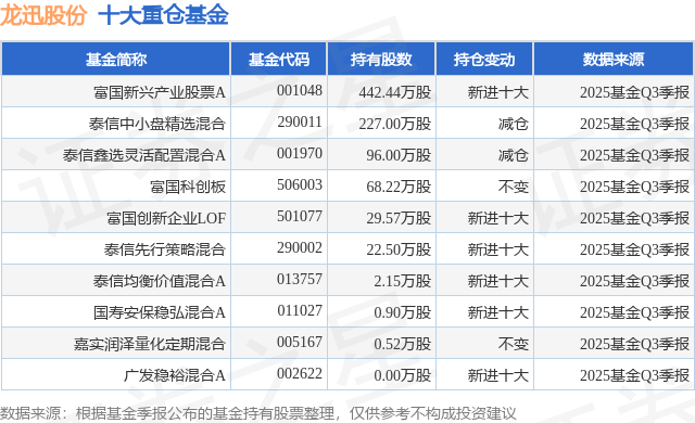 根据2025基金Q3季报公募基金重仓股数据,重仓该股的公募基金共10家,其中持有数量最多的公募基金为富国基金的富国新兴产业股票A。富国新兴产业股票A目前规模为60.77亿元,最新净值3.9693(1月6日),较上一交易日下跌0.29%,近一年上涨89.28%。该公募基金现任基金经理为孙权。孙权在任的基金产品包括:富国创新企业灵活配置混合(LOF)A,管理时间为2022年7月28日至今,期间收益率为47.37%。