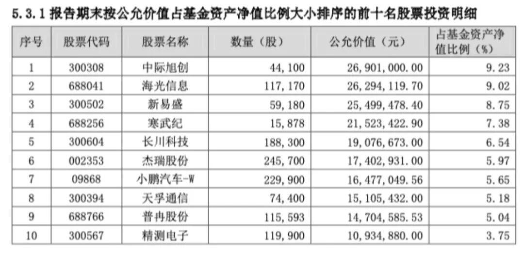 不过,与上季度相比,持仓结构有所调整,前十大重仓股半数换新。其中,中际旭创依然是第一大重仓股,持股数量有所下降,长川科技也出现小幅减持;海光信息则获大幅加仓,新易盛、寒武纪也得到增持。工业富联、生益科技、沪电股份、源杰科技、鼎泰高科退出前十大重仓股之列,杰瑞股份、小鹏汽车- W、天孚通信、普冉股份、精测电子为四季度新进重仓股。