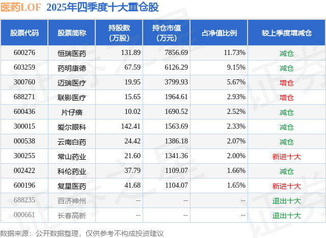 根据2025基金年报公募基金重仓股数据,重仓该股的公募基金共5家,其中持有数量最多的公募基金为国泰基金的医药LOF。医药LOF目前规模为6.54亿元,最新净值0.5427(3月3日),较上一交易日下跌2.09%,近一年上涨1.42%。该公募基金现任基金经理为梁杏 彭悦。梁杏在任的基金产品包括:国泰量化收益灵活配置混合A,管理时间为2018年7月31日至今,期间收益率为57.13%;国泰中证生物医药ETF联接A,管理时间为2019年4月16日至今,期间收益率为-1.62%;国泰中证生物医药ETF,管理时间为2019年4月18日至今,期间收益率为-3.15%。彭悦在任的基金产品包括:国泰国证食品饮料行业(LOF)C,管理时间为2025年8月13日至今,期间收益率为-7.33%;国泰中证港股通汽车产业主题ETF发起联接A,管理时间为2026年1月7日至今,期间收益率为-1.67%;国泰上证科创板人工智能ETF发起联接A,管理时间为2026年2月5日至今,期间收益率为2.51%。