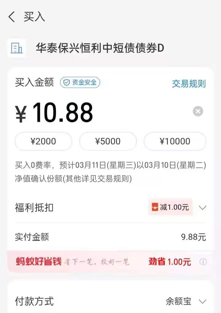 图:在支付宝渠道,华泰保兴恒利中短债D开展了立减一元的申购优惠 来源:蚂蚁财富